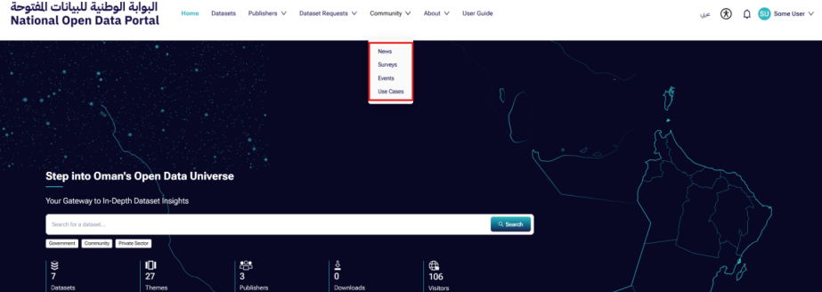 The Community section connects users with updates, events, and collaborative opportunities. It includes five main parts: News, Surveys, Events, and Use Cases.
