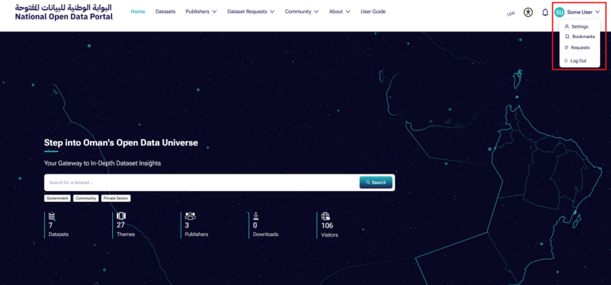 5. Once authenticated, you’ll see your profile name appear in the top-right corner, giving access to personal features such as bookmarks, requests, and logout.