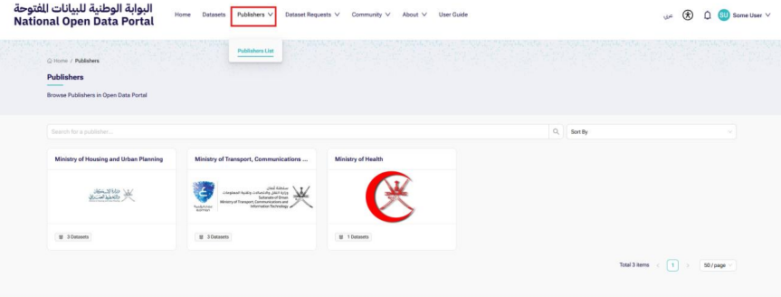 2. Browse the list of publishers displayed as cards, each showing the organization name, logo, and number of datasets.