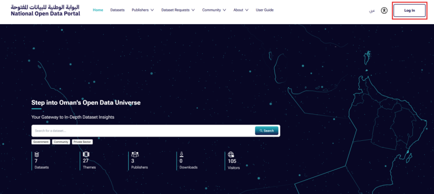 3. The homepage displays an intuitive layout with the main navigation bar at the top, including links to Datasets, Publishers, Community, About, and User Guide.